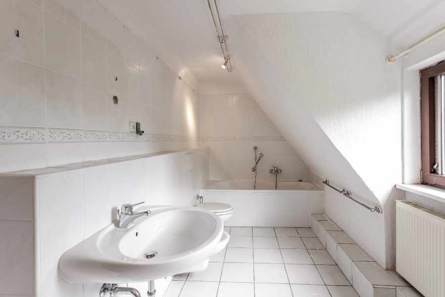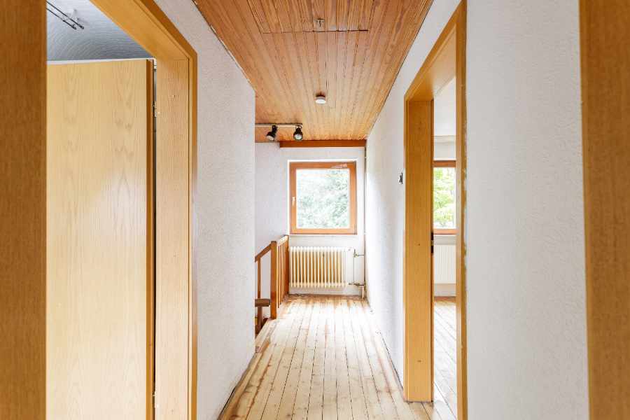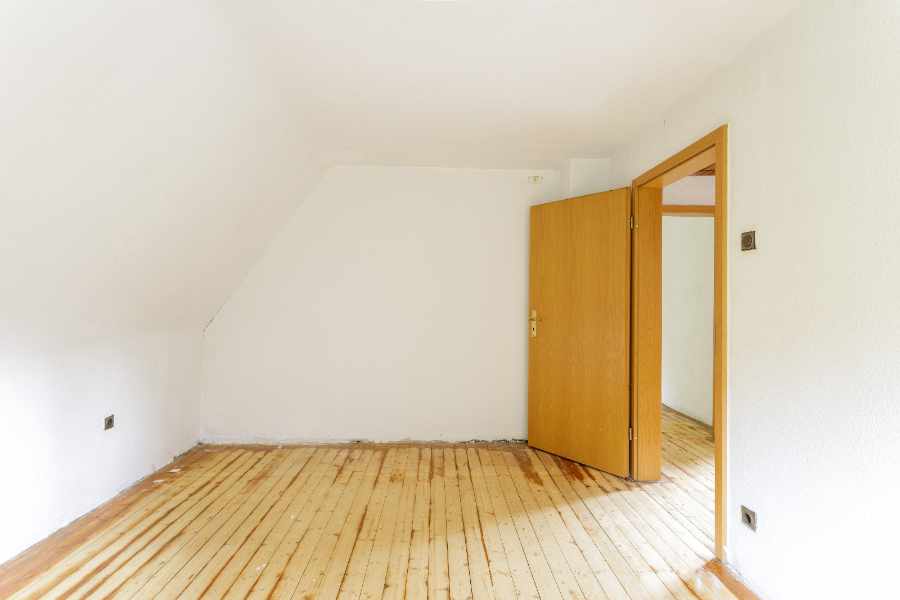Direkt vom Eingang gelangen Sie ins Obergeschoss, wo sich aktuell zwei Schlafzimmer sowie ein geräumiges Badezimmer befinden. Aufgrund des günstigen Neigungswinkel des Dach haben Sie die Möglichkeit, das Dachgeschoss auszubauen. Hier wären 2 kleine immer oder ein Schlafraum mit Masterbad denkbar.