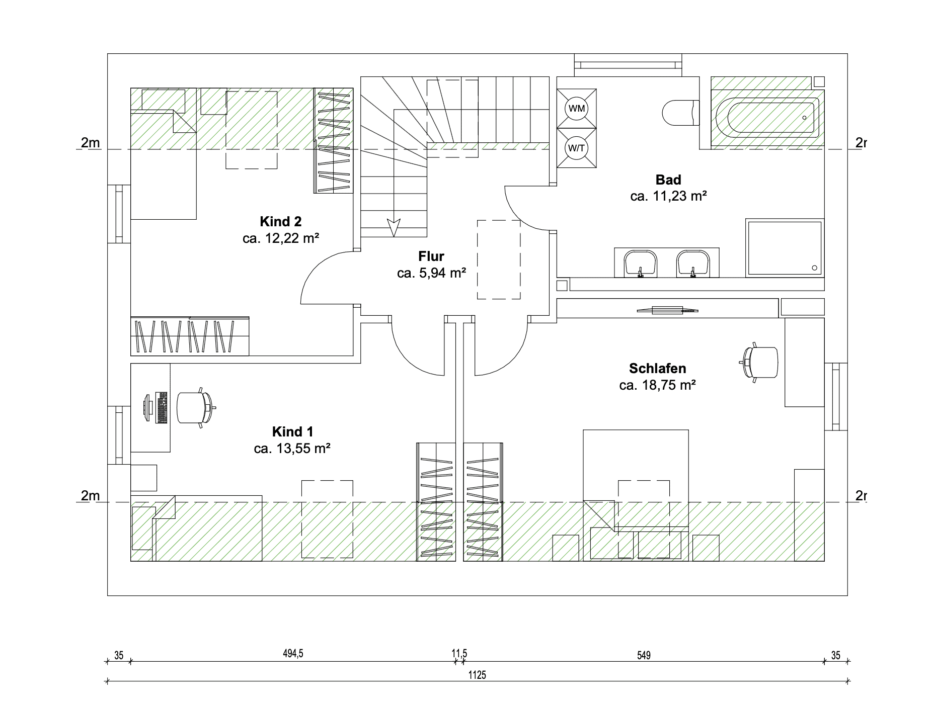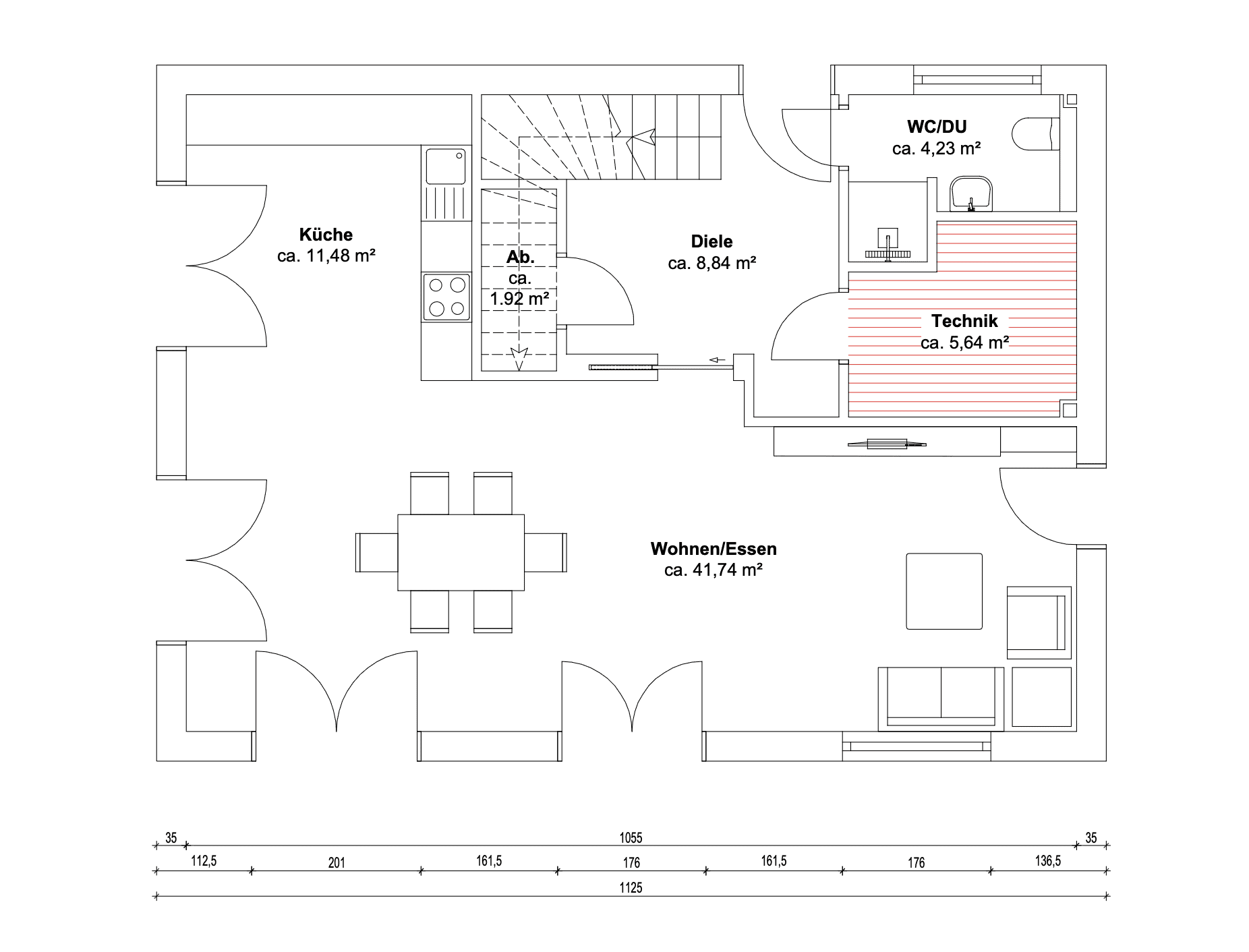 Der Sonne entgegen: das ideal ausgerichtete Grundstück ermöglicht eine Erschliessung von Norden und richtet das Wohn- und Esszimmer nach Süden aus. Durch diese perfekte Ausrichtung und durch den Wunsch, modern und offen zu Wohnen, wurde besonderen Wert auf einen großzügigen Essbereich gelegt. Diverse Abstellflächen sowie ein echtes Vollbad als Gäste-WC runden den Grundriss im Erdgeschoss ab.